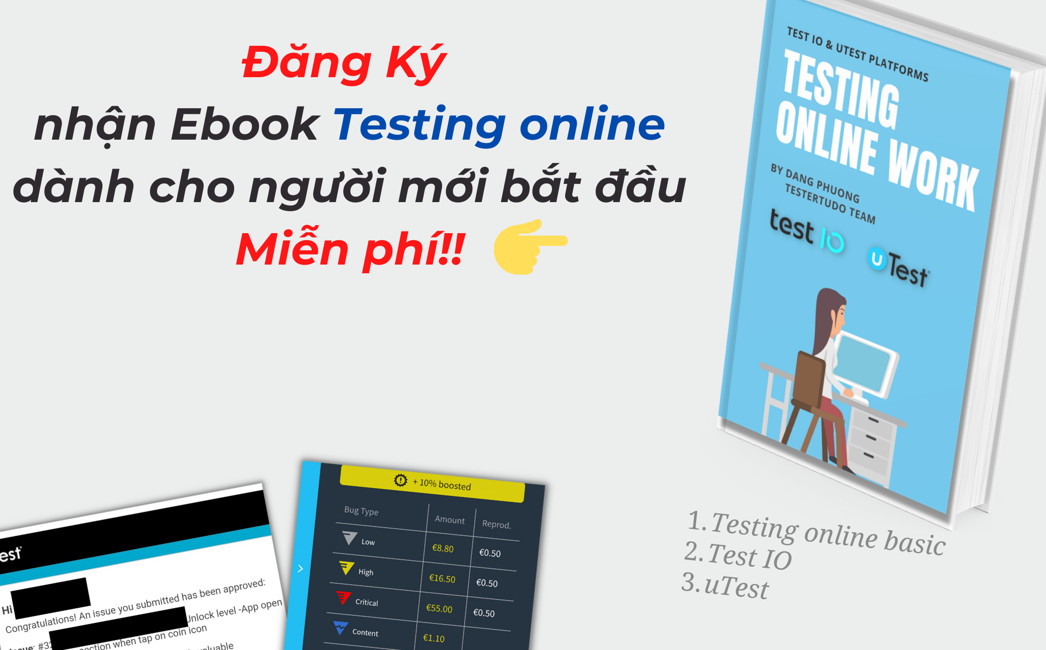 Ebook này được đội ngũ Testertudo team thực hiện để gửi cho mọi người hoàn toàn miễn phí và quan trọng hơn là nhằm cung cấp cho tất cả các bạn muốn tìm hiểu và học các kiến thức cơ bản về mảng kiếm tiền testing online giúp các tester có đủ nền tảng kiến thức căn bản để tự bắt tay tìm hiểu và tham gia kiếm tiền online trên các nền tảng Test IO và uTest.